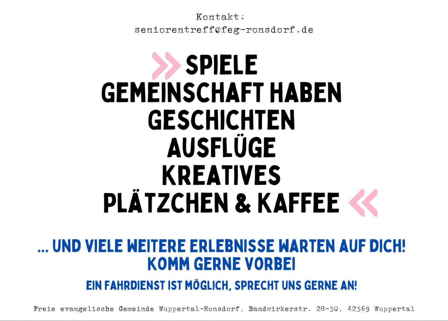Und wenn Sie lieber in einem überschaubareren Kreis ankommen möchten, dann erkundigen Sie sich nach unserem Senioren- oder einem anderen Hauskreis.