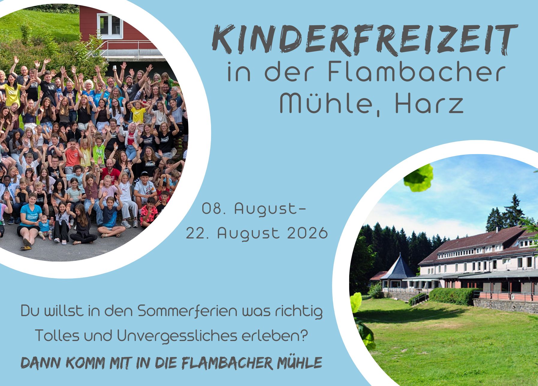 Die Kinderfreizeit findet seit 2008 im Harz statt. Das Freizeitheim, die Flambacher Mühle, liegt in der Nähe einiger Seen, in denen wir auch schwimmen gehen können. Die Umgebung bietet zahlreiche Möglichkeiten wie Floß- und Staudamm-Bauen, Wandern und Klettern und das Durchführen von Abenteuer- und Erkundungs-Touren.